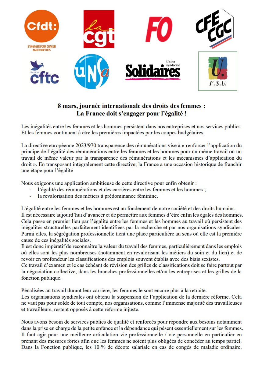 8 mars 2026 – Journée internationale des droits des femmes – Communiqué intersyndical 5 mars 2026 | Actualités, Conditions de travail, Vos droits | Retrouvez l’affiche du SNFOCOS à cette occasion :