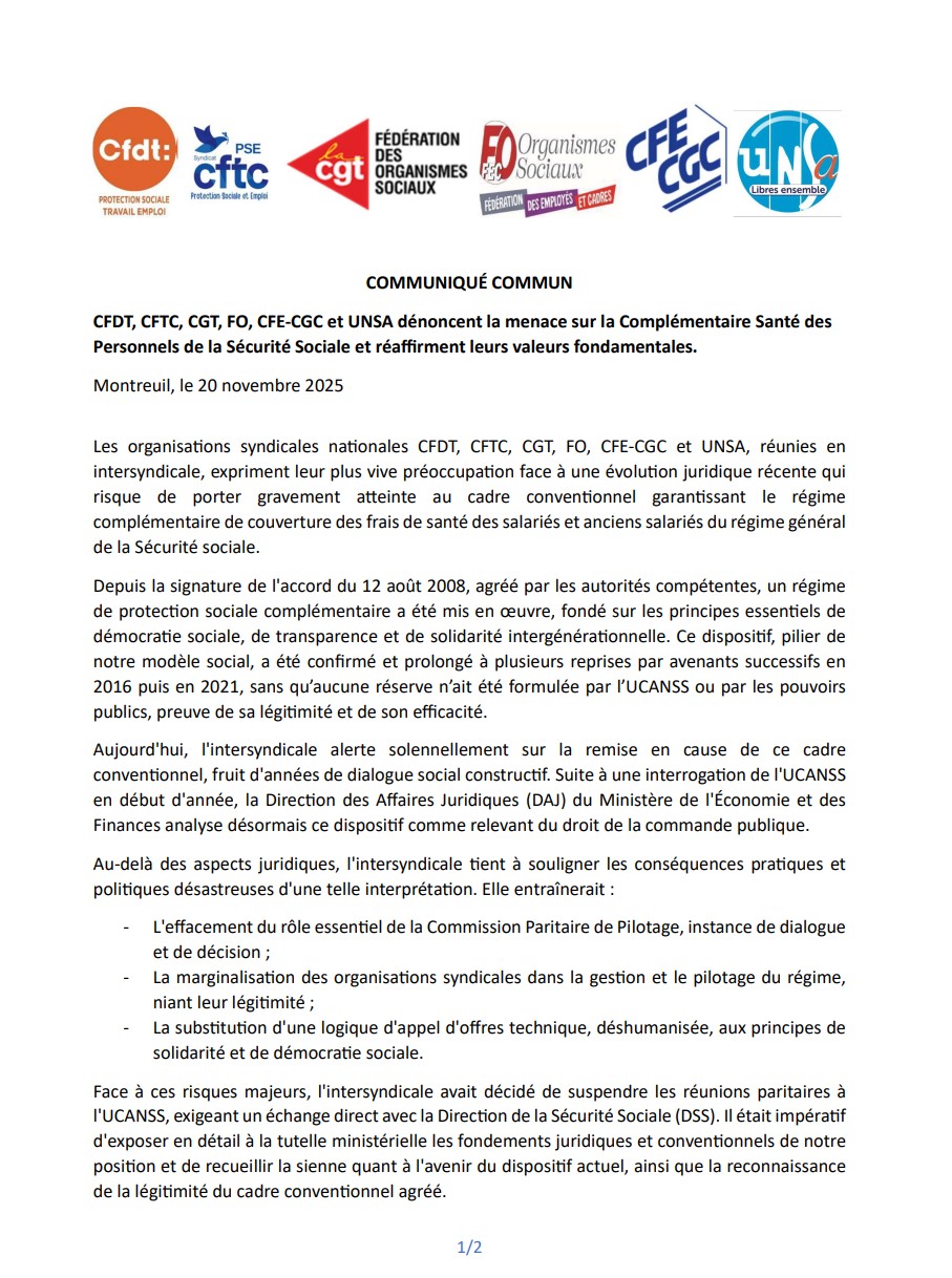 Complémentaire santé – Communiqué commun intersyndical dénonçant la menace sur la complémentaire santé des personnels de la Sécurité sociale 27 novembre 2025 | Actualités, Retraite complémentaire et Prévoyance, Vos droits |